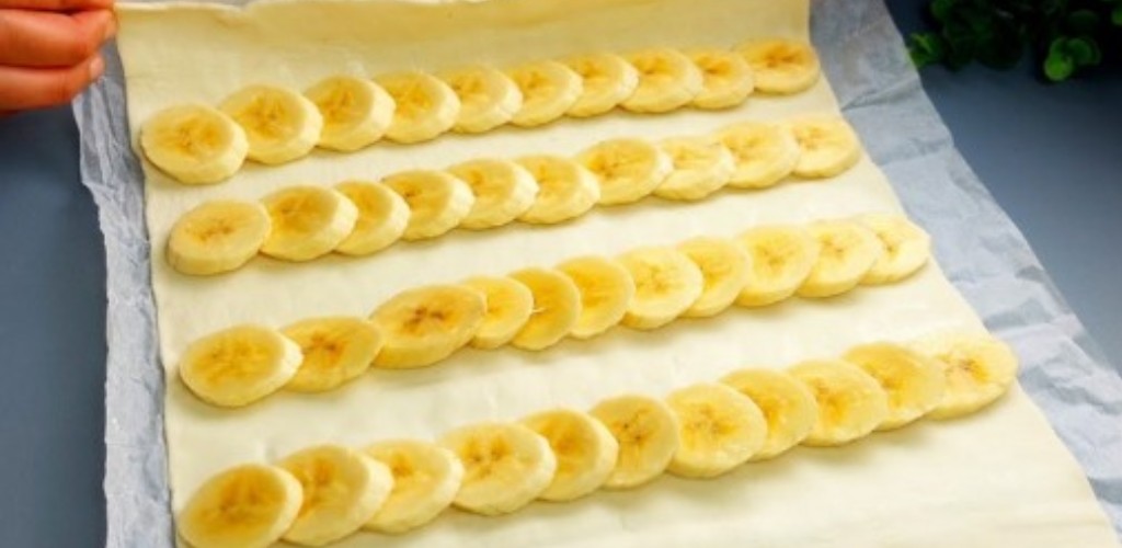 - Lay banana slices neatly in a single layer (or slightly overlapping) on the pastry. Leave a margin (edge) clear so the pastry can puff.