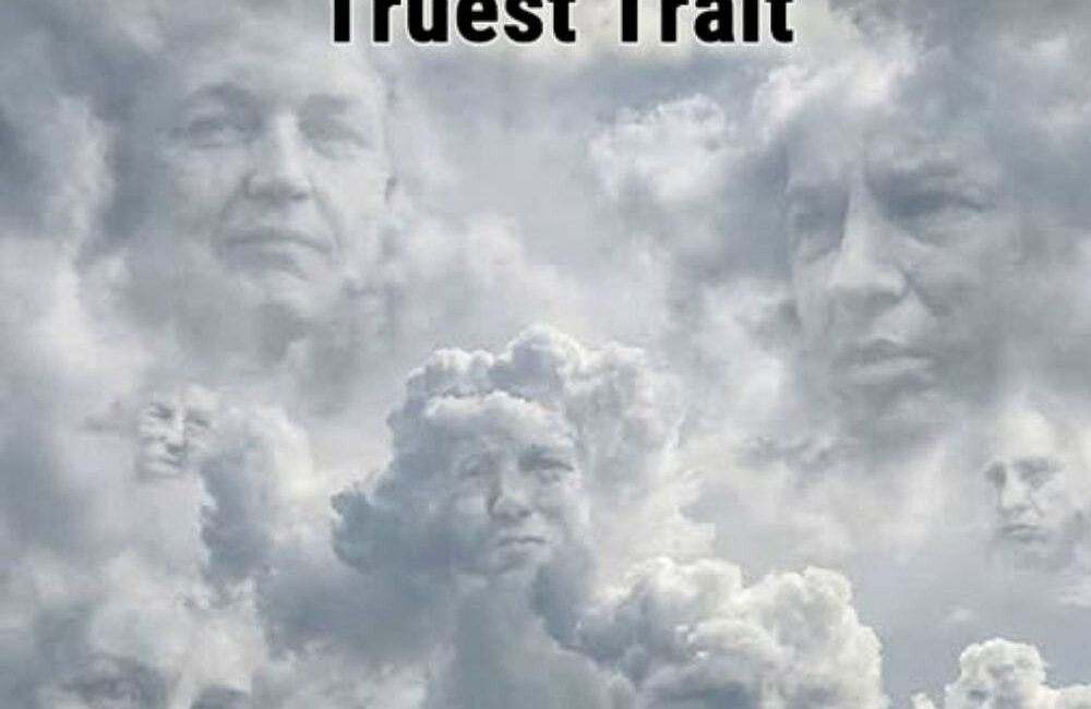 In the image, swirling clouds form faint but recognizable human faces. Some are large and prominent. Others are partially obscured. A few are small and require intense focus to detect.
